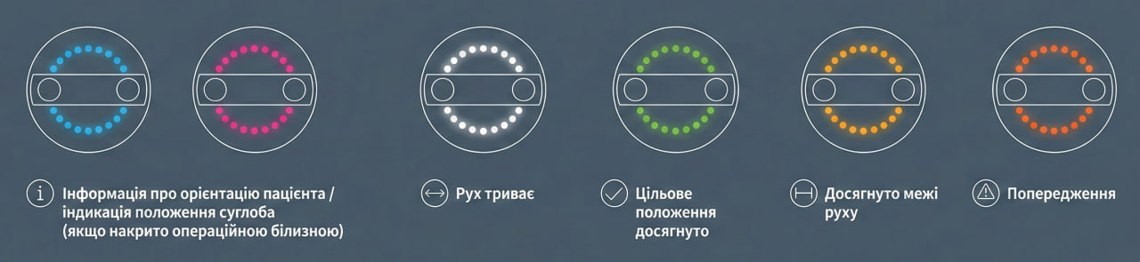 - Світлова індикація Feedback Lights: Система автоматично розпізнає та відображає орієнтацію стільниці. Кольорові підказки допомагають уникнути помилок у керуванні, їх чітко видно навіть крізь стерильне покриття