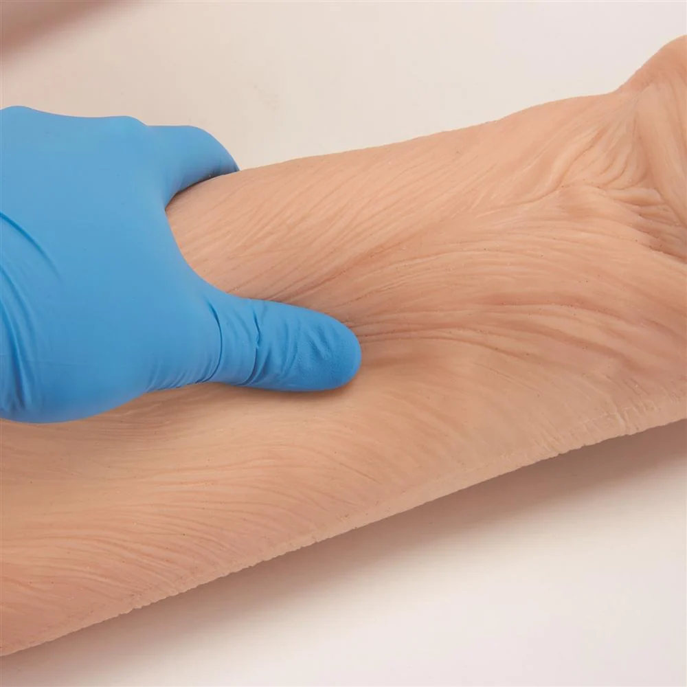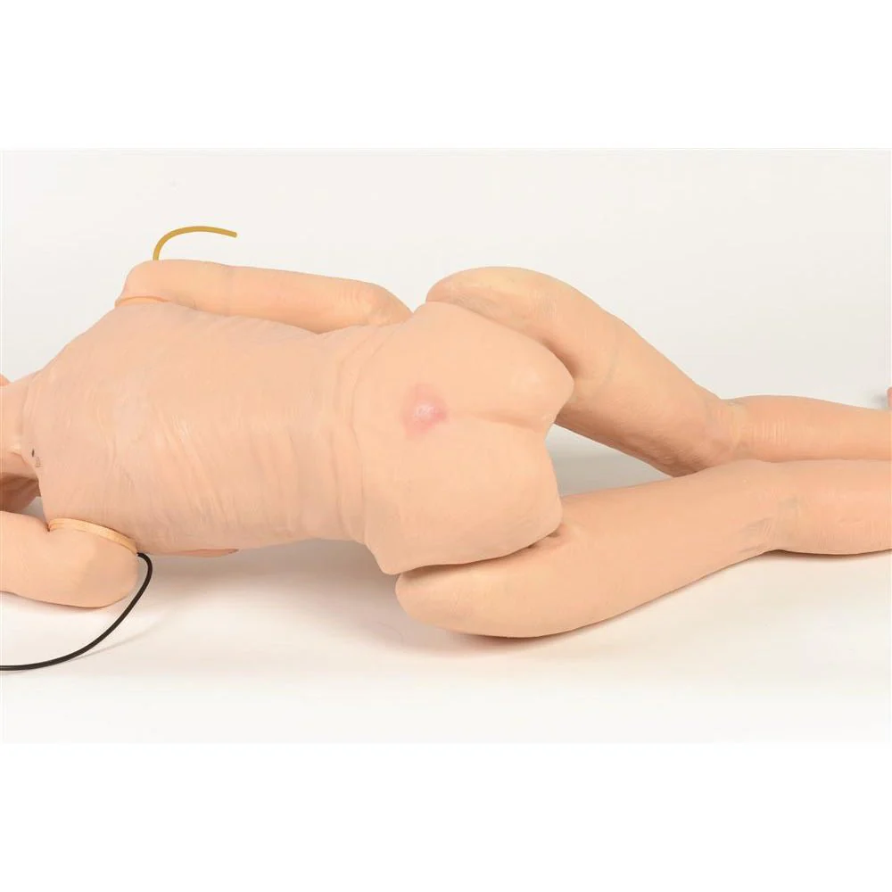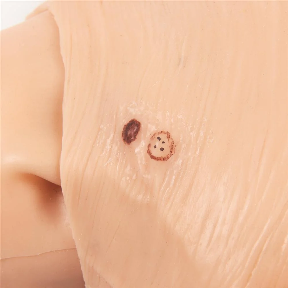 Манекен має м’яку силіконову шкіру, яка виглядає та відчувається природніше. Це робить навчання реалістичним і допомагає персоналу краще розуміти причини й підходи до ведення розривів шкіри.